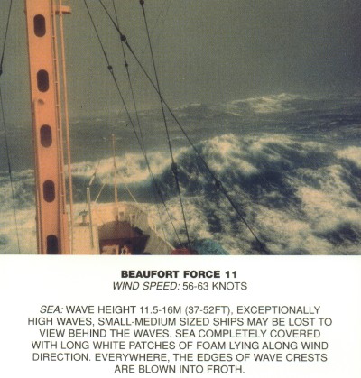 1) The wind has now reached force 10. The seas are already very high with white crests and the air is white with spray. Captain James has been through many storms. He knows that he will need all his skill and experience to save the ship from damage or loss. There are many important factors to consider - the wind direction and force, the course being steered, the height of the sea, and whether the sea is short or long. In a strong headwind the vessel will pitch. When the wind is abeam the ship, we say that she is rolling. Not only the height but the length of the seas is important.